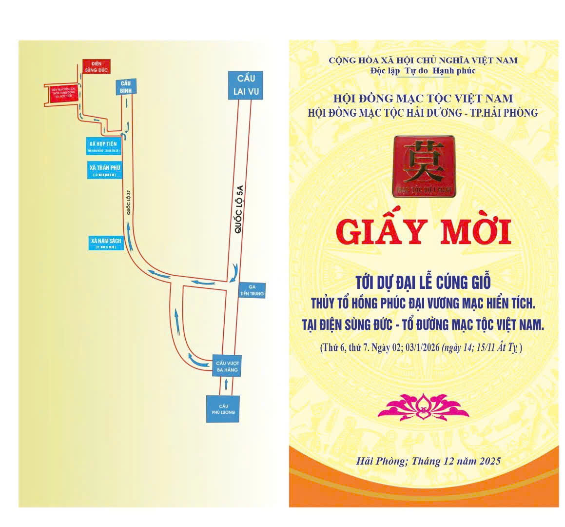 TRÂN TRỌNG KÍNH MỜI HĐMT CÁC TỈNH THÀNH, BÀ CON CÔ BÁC HỌ MẠC, GỐC MẠC VÀ DU KHÁCH THẬP PHƯƠNG VỀ DỰ LỄ CÚNG GIỖ THUỶ TỔ HỒNG PHÚC ĐẠI VƯƠNG MẠC HIỂN TÍCH TẠI ĐIỆN SÙNG ĐỨC- TỔ ĐƯỜNG MẠC TỘC VIỆT NAM NĂM ẤT TỴ