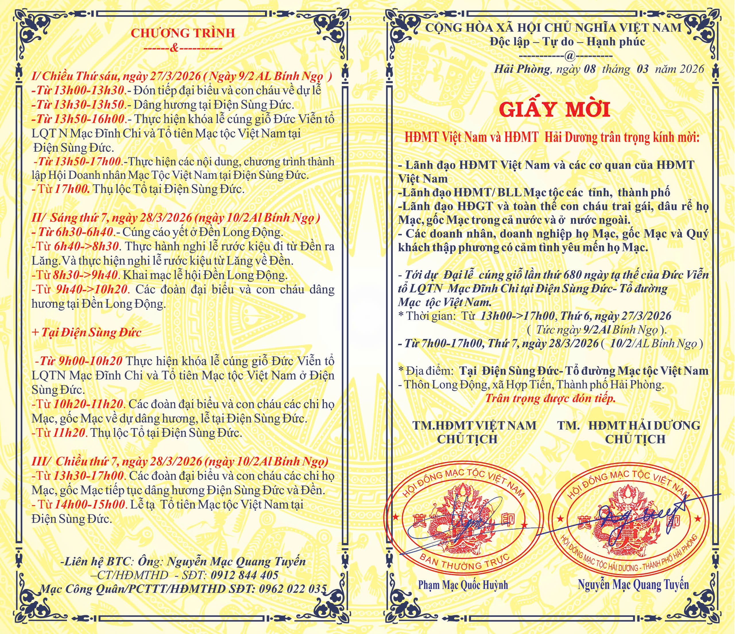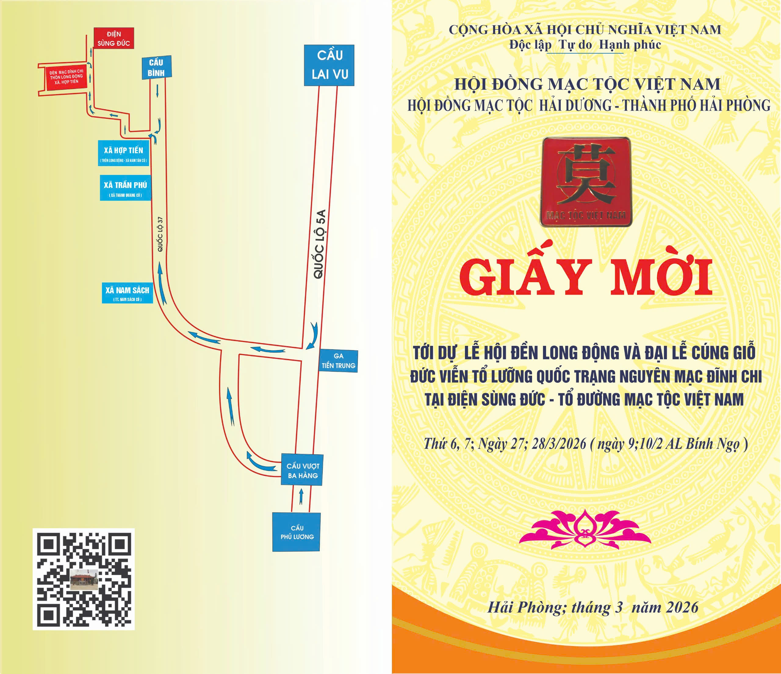 TRÂN TRỌNG KÍNH MỜI LÃNH ĐẠO HĐMT VIỆT NAM, CÁC PHÒNG BAN CƠ QUAN HĐMT VIỆT NAM; HĐMT – BAN LIÊN LẠC HỌ MẠC CÁC TỈNH THÀNH CÙNG BÀ CON CÔ BÁC HỌ MẠC, GỐC MẠC TOÀN QUỐC VỀ DỰ ĐẠI LỄ CÚNG GIỖ ĐỨC VIỄN TỔ LƯỠNG QUÔC TRẠNG NGUYÊN MẠC ĐĨNH CHI TẠI ĐIỆN SÙNG ĐỨC – TỔ ĐƯỜNG MẠC TỘC VIỆT NAM